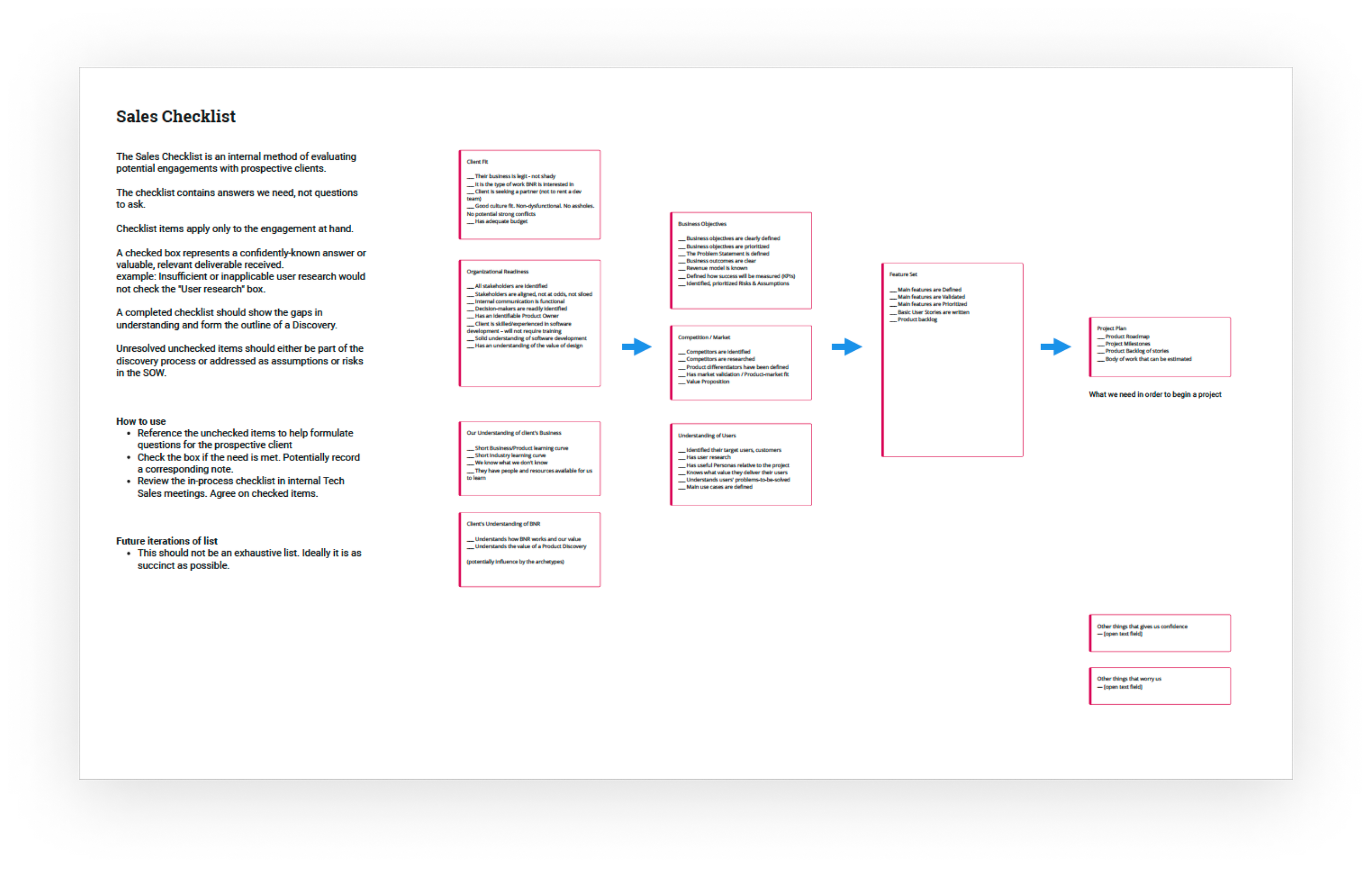 Process Analysis, Stakeholder & User Interviews, Workshops and Surveys, Discovery Templates and Discussion Guides, Sales Checklist and Handoff Guidelines, Standardized Discovery Playbook and Rollout Strategy, Sales Checklist, Rollout Strategy