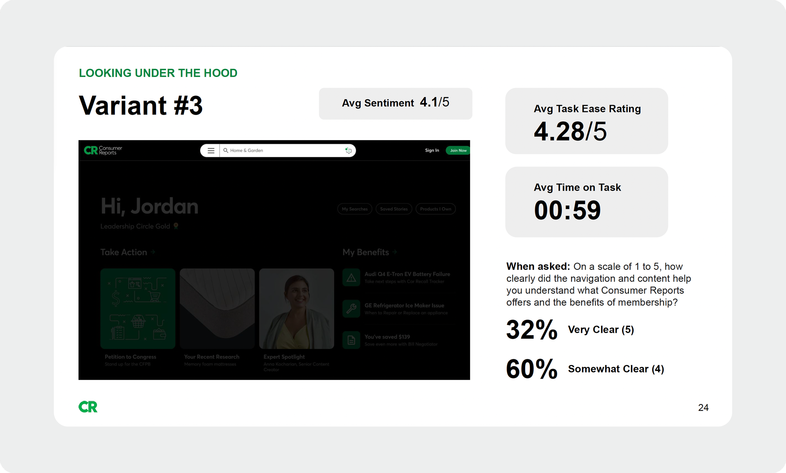 I synthesized quantitative results into a stakeholder readout with clear, actionable recommendations—leading to the selection and refinement of Variant #2, adoption of polyhierarchy for cross-category content, and guidance on masthead structure, search prominence, and reduced friction to support diverse mental models.